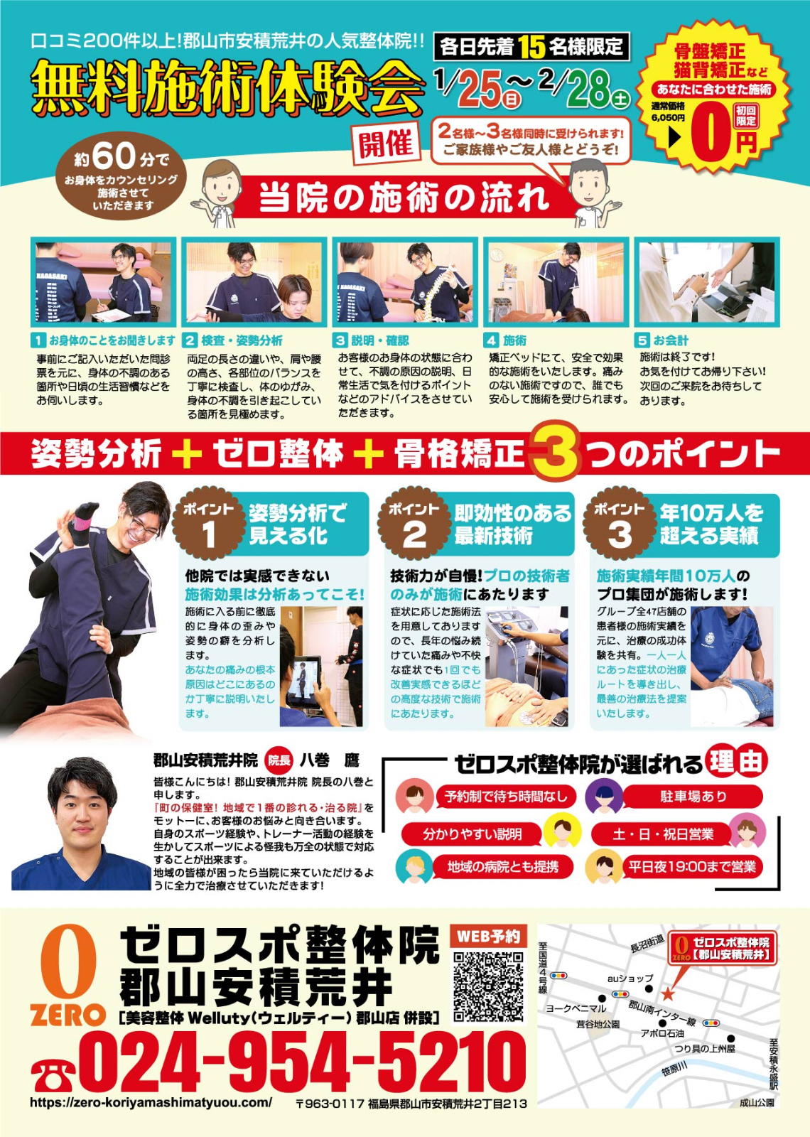 全国50店舗以上展開のMOVEACTIONグループが1月25日(日)「ゼロスポ整体院 郡山安積荒井」をオープン! 前日の24日(土)10時〜13時に、オープン記念として「野菜の詰め放題」を参加無料で開催します。 お子様限定でお菓子のつかみ取りも同時開催! さらに1月25日(日)〜2月28日(土)までは、1日15名限定の無料体験会も! ただいま随時予約受付中です! お身体のことで気になる痛み、悩みをお持ちの方、この機会にぜひ当院の施術をご体感ください!! [ゼロスポ整体院 郡山安積荒井] (ゼロスポ鍼灸院・接骨院 郡山安積荒井併設) 住所:〒963-0117 福島県郡山市安積荒井2丁目213 電話番号:024-954-5210 【平日・土日祝】10:00〜19:00(予約優先) 定休日:なし https://zero-fukushimanishi.com ▼ご予約は下記から▼ https://bookom.jp/reservation?company=25&course=3614&defaultLang=ja&shop=355